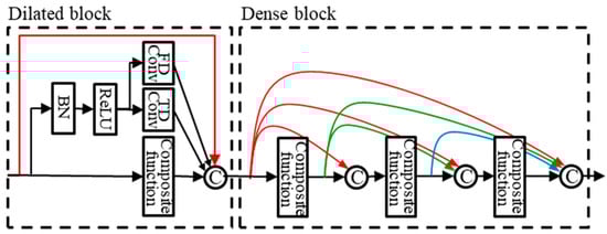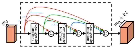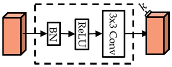 DenseNet [18] is a dense block structure consisting of composite functions as shown in Figure 1. A composite function consists of three consecutive operations: batch normalization (BN) [26], followed by a rectified linear unit (ReLU) [27], and a convolution (Conv), as shown in Figure 2.