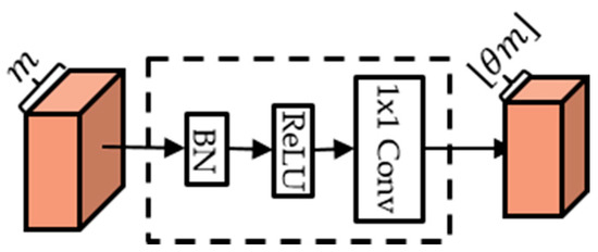 Due to the concatenation characteristics of DenseNet, the number of feature maps increases very much depending on the growth rate, the number of composite functions and dense blocks. To reduce the number of feature maps, compression blocks are added at the back of the dense block. The compression block consists of BN-ReLU- Conv as Figure 3. If the number of the output feature maps of the dense block is , then the number of feature maps created from compression becomes an . Compression rate is a value in the range , and when , the number of feature maps for input and output is the same.