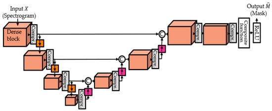 - Takahashi, N.; Goswami, N.; Mitsufuji, Y. MMDenseLSTM: An efficient combination of convolutional and recurrent neural networks for audio source separation. In Proceedings of the International Workshop on Acoustic Signal Enhancement (IWAENC), Tokyo, Japan, 17–20 September 2018; pp. 106–110. [Google Scholar]
