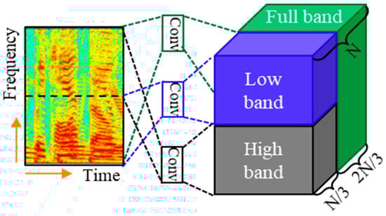 The patterns in the spectrogram are different along with the frequency band. The lower frequency band tends to contain high energies, tonalities, and long sustained sounds, while the higher frequency band tends to contain low energies, noise, and rapidly attenuated sound [15]. To reflect these, a multi-band block with a different convolution filter is applied by dividing the spectrogram frequency in half, as shown in Figure 6. Conv of the figure is the convolution of kernel. In addition, the entire spectrogram is convolved to obtain a feature map containing information of the entire spectrogram. The final output is obtained by concatenating the two half bands and the full band feature maps. Since we have observed in preliminary experiments that interchanging the order of the feature maps yields improved performance, we interchange the order of the feature maps for low and high bands in a multiband block.