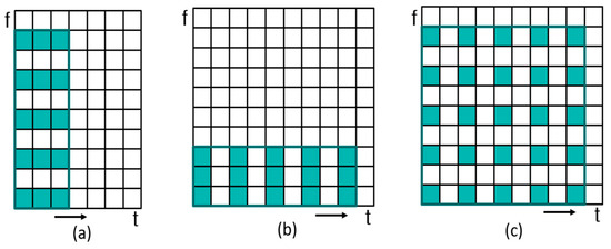 Dilated convolution. (a) Frequency-dilated convolution, (b) time-dilated convolution, (c) 2-dilated convolution.