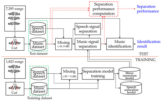The music identification experiment has the structure shown in Figure 9. The separation model is trained using mixed music and speech signals as inputs and each original signals as a reference in the training process. In the test process, the mixed signal is separated into the speech and music signal by the trained each separation model, and fingerprinting features are extracted from the separated music signal. The separated speech signal is only used to measure the separation performance. Music identification is performed in the fingerprinting database using the landmark-based fingerprinting feature [33] of the separated music signal. We can obtain the identification result, and we can also calculate the separation performance from the separated signal.