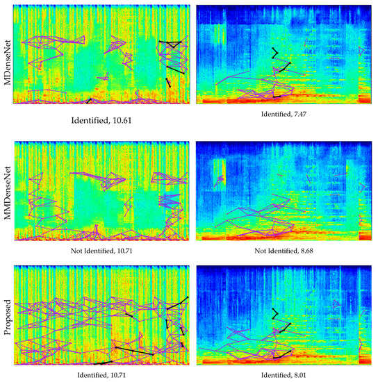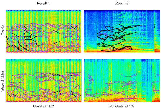 Figure 10 shows the music identification results and the fingerprinting features at the spectrogram for the query signal of each separation system. Fingerprinting features appear up to 5512 Hz by the setting of the identification system. These figures show that MDenseNet and MMDenseNet are poorly identified despite high SDR. In Result 1 of the figure, the separated signal by MMDenseNet with the second-highest SDR fails to be identified. However, the proposed architecture with the same SDR performance as MMDenseNet is successfully identified. In Result 2 of the figure, identification is successful although MDenseNet produces lower SDR than MMDenseNet. In contrast, MMDenseNet has the highest SDR but fails to be identified.