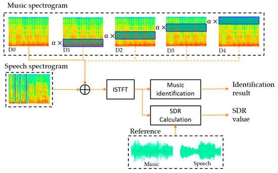 We experimented to see how the frequency band distortion of the spectrogram affects SDR. As shown in Figure 11, the spectrogram of music signals was divided into four bands (D1~D4) and multiplied by the weight for each band to distort it. The music signal without distortion is called D0. We added the distorted music spectrogram to the speech spectrogram and restored it to the signal. Finally, the SDR was calculated using the distorted mixture signal and the reference signals with 16 kHz sampling rate. In addition, the identification experiment was performed using the distorted mixed signal. The fingerprinting database was extracted at 16 kHz sampling rate from 7295 songs. We used the distortion weight as 0.3. The 1000 samples mixed with 0 dB SNR were tested.
