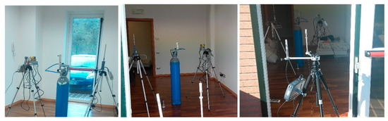 The tracer gas was supplied by a compressed tank of CO2, with a critical orifice and a gas flow rate measurement device (Figure 3). The minimum flow rate and the duration of the CO2 introduction were established in compliance with the standard [18] as a function of the volume of the room. In order to create a uniform gas concentration in the investigated volume, fans were switched on before each test; this procedure allowed to obtain a uniform concentration of the gas tracer in different points of the room volume, such as verified in the previous work [31]. The presence of people in the test room is a carbon dioxide source, so its concentration was recorded before the tracer gas introduction, in order to have a reference value for the MAA calculation; operators stayed outside the room during the measurements, but the limits of the European Agency for Safety and Health at Work (2010) were anyway considered. As the maximum concentration was reached, the decay started. The acquisition rate of the concentration of the gas tracer was generally 1 min; longer acquisition rates (2, 3, 5, and 10 min) were set when the decay was very long-lasting, especially in the configurations with the closed window. The CO2 concentration was registered for a total time greater than the expected average age of air.
