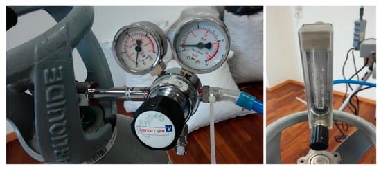 The CO2 was supplied by means of a pressurized tank, equipped with a pressure adaptor (DIM 200-15-25.S) in stainless steel 316 L and Hastelloy C (Figure 3 left) and a flux meter Kobot Instrument Kit KDG-212-JNG600 for very low flow rates, with a spherical suspension floating probe (Figure 3 right).