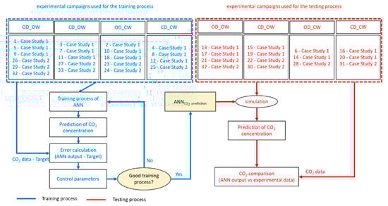 It is worth noting that time and CO2 gas injection are two key parameters to be supplied, being the only ones closely related to the increase of CO2 within the room, but all the considered parameters affect its decay over time. Furthermore, for the ANN implementation, the CO2 gas injection was set to the established values only for the time steps the tank was open, and set to zero for all the other time steps. As in [37,38,39], a sensitivity analysis was performed in order to establish the best number of neurons to be used in the hidden layer and to minimize the error of the network. The procedure adopted for the implementation of the artificial neural network able to predict the CO2 concentration within the room is shown in Figure 4. In particular, the experimental campaigns used for the training and testing processes are highlighted; they were chosen randomly; the only criterion adopted was to choose for both processes at least one survey for each configuration and case study. It is important to point out that in Figure 4 the algorithm developed after the training process was named ANNCO2concentration; i.e., it is the name of the trained network which can be used for CO2 prediction. The accuracy of the training process is checked by considering two control parameters: regression value (R) and the mean square error (MSE). The first one allows to correlate the outputs of ANN with experimental values (target) and when it is equal to 1, it means that a perfect correlation is found. MSE allows to evaluate the most probable error returned by the network, therefore the more the MSE is close to 0, the more the accuracy of ANN is high.