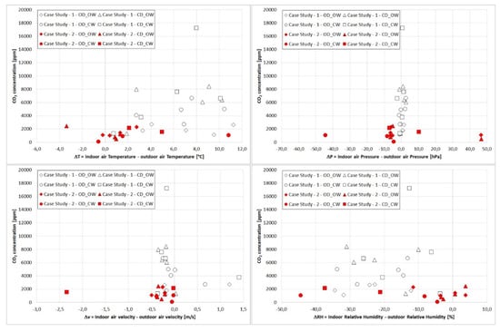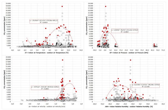 Figure 5 shows the CO2 concentration within the room as a function of the difference of the main environmental conditions (temperature, pressure, air velocity, and relative humidity). The CO2 concentration monitored step by step within the room does not seem to be significantly affected by the environmental conditions (white dots with black edges); however, the maximum values reached in each experimental campaign (red dots) seem to be. In fact, the higher maximum values of CO2 were found in the following range: ∆T in 7–9 °C, ∆P in −3–3 hPa, ∆v in −0.27–0 m/s, and ∆RH in −34%–−10%.