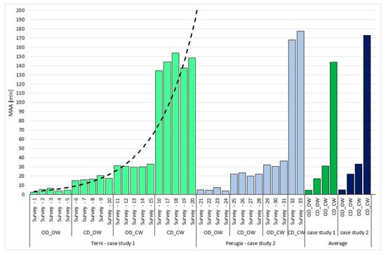 Based on these results, the MAA indicator was calculated for each experimental campaign. Figure 7 shows all the MAA values and the average ones calculated for each configuration and case study. As highlighted, the MAA increases exponentially varying the room configuration; in particular, for both case studies the highest values were calculated for the last configuration (CD_CW), which can be considered the worst room configuration. The average values calculated for OD_OW, CD_OW, and OD_CW are very close for the two case studies and equal to 4.7–5.3 min, 17.2–22.1 min, and 31.1–33.1 min for Terni (1) and Perugia (2), respectively. Only for the CD_CW configuration, a higher difference of the MAA mean value was focused (163 min vs. 143.6 min); according to the results, in all the configurations, a higher MAA value was found for the case study 2, probably due to both the higher window airtightness and bigger volume of the room.