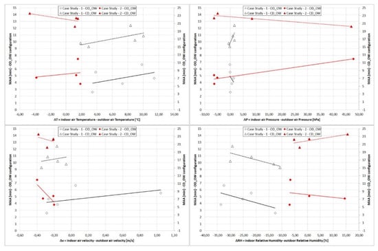 Interesting correlations can be found when considering the mean difference of all the environmental parameters. MAA increases when the difference between the indoor and outdoor mean temperature increases, in all the studied configurations, except for OD_OW (case study 2) and OD_CW (case study 1): the dependence is emphasized for the configurations with the closed window, where a higher slope of the regression lines is found. A specular trend was instead found considering the mean difference of relative humidity. Furthermore, considering the mean difference of air velocity and of air pressure, an opposite trend for the two case studies was also highlighted; in fact, when MAA indicator increases for one case study, it decreases for the other one. For instance, considering the difference of the air pressure, for case study 1, the MAA increases in CD_OW and OD_CW configurations and decreases in OD_OW and CD_CW ones; the same indicator decreases in CD_OW and OD_CW and increases in OD_OW and CD_CW for the case study 2. The same trend can be highlighted considering the difference of the air velocity. This important divergence can be due to the different characteristics of environments (volume), to the dimensions of the openings (opening surfaces), and to the window airtightness class.