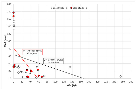 According to Equation (2), G represents the air volume changed in one hour within the room. In Figure 10, it is possible to notice a significant difference in behavior of the regression lines drawn for the two case studies. The slope of the lines (case study 1 in black and case study 2 in the red) mainly depends on the airtightness of the windows; in fact, G tends to increase with decreasing of the window airtightness class (Class 1–2 for the case study 1), due to the higher air permeability. In particular, as expected, it is worth noting that the opening surfaces influence the MAA indicator especially in a room with windows with higher airtightness class; it means that in the case study 2, the opening surface area is more effective than case study 1, despite the difference of total opening area of just 1 m2.