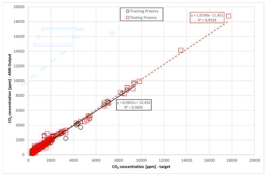 Results related to the implementation of the network are shown in Figure 11 and Figure 12. In particular, Figure 11 shows the comparison between the CO2 values monitored during the experimental campaigns (on the abscissa—target) and the one simulated by ANN (on the ordinate—ANN output) for both the considered processes (training in black dots and testing in red box). In this figure, in order to highlight the accuracy of the ANN, the regression line for each process was also drawn: R2 values equal to 0.98 and 0.99 were found for the training and testing processes, respectively.