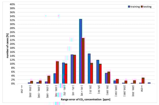 Furthermore, all the results shown in Table 6 are in agreement with the trained ANN; in fact, as also shown in Figure 12, the network tends to predict a CO2 concentration with a slightly higher error in the testing process (most probably error in −100 + 100 ppm), so it can lead to less accuracy in the MAA calculation.