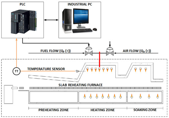 The slab reheating furnace under study is provided with a heating zone temperature sensor, air flow, and fuel flow sensors, as well as two proportional valves for the control of the critical variables. Additionally, this furnace has a SCADA supervision system (WinCC) for monitoring the entire production process, which favors the work of collecting and storing input and output data [38,39,40,41].