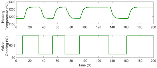 The fuel flow valve was excited in order to obtain a variation of the heating zone temperature in the slab reheating furnace. To achieve this, the valve was manipulated, generating an increase of 60.9% to 65.8%, which is within the range of nominal operating variations of the fuel flow in the heating zone of the slab reheating furnace under study.