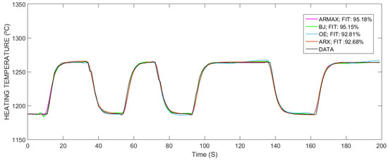 Different discrete model structures (ARMAX, BJ, OE, and ARX) were evaluated and parameter estimation was performed using the error prediction method. For the validation of the model, a comparison was made between the results of the model obtained and the results of the measured plant as shown in Table 1.