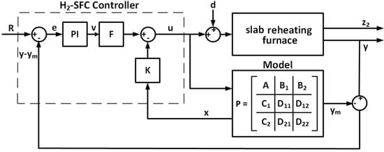 Figure 5. Block diagram of the heating zone temperature control system of the slab reheating furnace under study with the designed H2 state feedback controller (H2-SFC) controller.