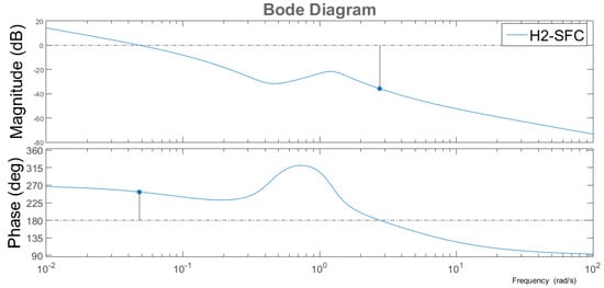 From the point of view of classical control, the robustness of a control loop is evaluated through the phase margin (Фm) and gain margin (Am) indicators [45,46]. Figure 10 shows the Bode diagram of the system with PI/PID controller under the influence of the external disturbance d(k) with phase margin (Фm) equal to 50° and with gain margin (Am) equal to 27.4 dB.
