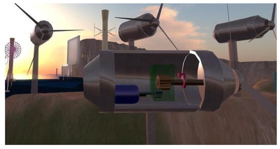 The AVARES 3D virtual world has various virtual constructions, power plants, buildings, and educational infrastructure that resembles the real world and visualizes the way that various procedures are performed. Students have the opportunity to visit virtual constructions and plants in order to examine the exact way they operate and the procedures they perform. In addition, an important aspect of the 3D virtual world is that it offers training activities that rely on the principles of constructionism [,]. In greater detail, parts and modules of various constructions and machines can be combined together and interlinked so as to create complex and sophisticated constructions. Students can examine the parts of constructions and can inspect the way they operate. Figure 1 illustrates a virtual construction that visualizes and simulates a wind turbine.