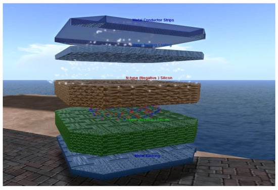 The 3D virtual world environment, offers learners various courses on the fields of environmental engineering and energy generation from renewable sources. Each course consists of various learning topics and has a wide range of complementary multimedia learning material in various formats. Learners can study the theory of each course that comes mainly in the form of text-based presentations. Therein, students have the opportunity to study in the virtual world the theoretical parts via presentations and examine the operation of corresponding 3D virtual constructions that simulate and visualize theoretical concepts and procedures. Figure 2 depicts an example of a virtual 3D construction that illustrates the main layers of photovoltaic cells and visualizes the functionality and the operations that take place at each layer.