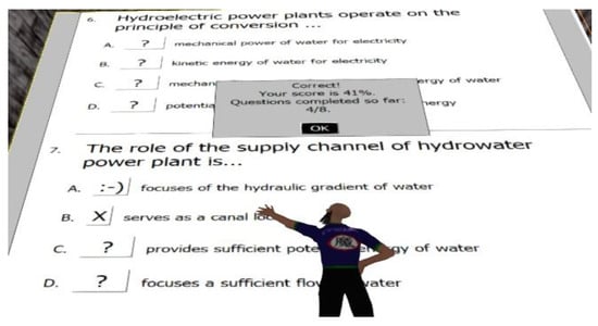In the AVARES virtual world environment, a wide spectrum of learning scenarios and approaches has been formulated and are available to learners. In general, the environment offers educational procedures and training activities that rely on the principles of constructionism and gamification []. Learners can participate in activities that require them to manipulate and interact with constructions in the context of gamification scenarios. In this context, parts and modules of various constructions and machines can be combined together and interlinked so as to create complex and sophisticated constructions, fix malfunctioning devices, etc. For example, learners can participate in learning scenarios where electrical failures have occurred and have blacked out energy production in a factory. Students can work as individuals or as small teams to diagnose the failure and make proper actions to fix it. Therefore, in order to fix the problem and accomplish a learning activity (e.g., a blackout, a malfunctioning wind turbine, etc.), learners have to investigate the corresponding power plants and machines, diagnose the origin of the issue and the malfunction and after that specify the appropriate actions that have to be made in order to fix it. The solution can require specifying first the faulty parts of a malfunctioning machine and then replacing them by determining the appropriate items that are suitable and have the proper requirements. Then, after students have successfully repaired the malfunctioning machine and have resolved the problematic situation, proper rewards can be given to them. What is more, in many training activities, students can be given practice exercises, consisting of sets of questions to answer, that require that they visit factories and examine special procedures or devices and interact with them. The purpose can be to investigate these processes and interact with the machines and the corresponding devices in order to comprehend the way that they function and, after doing so, determine the proper answers to the questions. In the context of the training activities, students can participate as individuals or even as small teams that have two or three students and so the training activities can cultivate and improve their collaboration and communication skills. What is more, the training activities can offer conditions that stimulate active cooperation among the students and the embodied pedagogical agents in the educational environment [].
