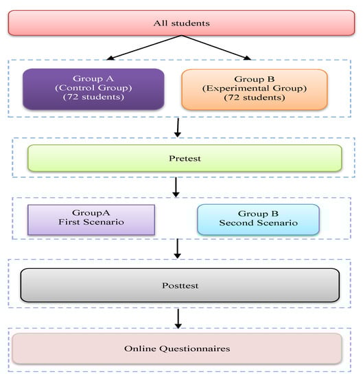 An experimental/control, pretest/posttest approach was followed in the study. Its phases are illustrated in Figure 5. Initially, the participating students in the study were asked to create their accounts in the AVARES environment. During the registration, personal information such as gender, years of study, and contact information were requested. After that, the students were randomly divided into two size groups that had the same size of 72 students each, and were named GroupA and GroupB respectively. The rates of girls and boys in GroupA were almost the same as GroupB.