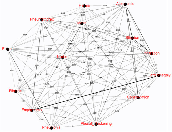 Figure 2, generated using gephi software, shows the CLA network built by Algorithm 1 and correlation intension between two lesions are labeled as edge weights. The thickness of the edges rather than the length also reflects the strength of the association between the two lesions. The thicker is the edge, the stronger is the association. According to different combination of lesions in ChestX-ray14 dataset, different subgraphs are detected, as shown in Figure 2. Algorithm 2 was used to process these subgraphs and output updated label orders.