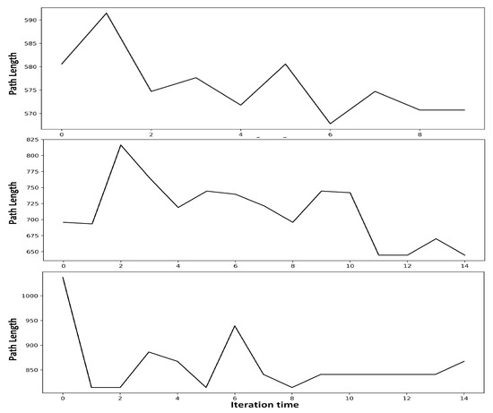 Figure 3 shows that the ant colony algorithm in Algorithm 2 gradually converges to the shortest path as the number of iterations increases. It can be seen that the shortest path in each subgraph can be found after around 10 iterations. According to the number of nodes in the subgraph, the number of iterations in our experiments were set as 8, 14, and 20, respectively.