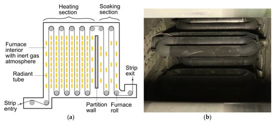 (a) Schematic of the annealing furnace of a continuous strip galvanizing line (CGL); (b) View from the bottom into the heating section of an annealing furnace.