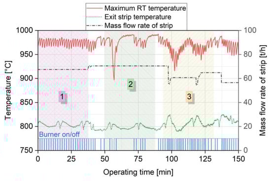 Radiant tube lifetime is influenced by its surroundings and their varying parameters resulting from process changes inherent in the operation of an annealing furnace of a CGL. The burners installed in recirculating radiant tubes are normally operated in on/off firing mode, in order to ensure better temperature uniformity on the tube as well as low NOx-emissions. The on-state corresponds to the burner operation at full-load (100% power). In temperature-controlled systems, the burner is switched to off-mode when a specified maximum temperature is reached. As soon as the temperature is too low, the burner is switched on again. Alternative furnace control systems operate based on the strip outlet temperature or the required energy input into the furnace. Model predictive control strategies can be used to anticipate the short term future process behavior and push the process towards its limits [5,6]. Additionally, a sequential firing logic is implemented into the furnace control system to set the burner on/off firing cycles for each radiant tube [7]. A radiant tube in a CGL furnace not only experiences cyclic thermal loading due to burner on/off firing but is also exposed to changes in temperatures arising from heat transfer (mainly radiative) to its neighboring tubes, the furnace chamber, and the passing strip. Figure 3 illustrates the influence of surroundings on the surface temperatures of a double-P-type radiant tube in an annealing furnace of a CGL for steel strips. The mass flow rate of strip is calculated as the product of the strip’s cross-section, its velocity magnitude, and its density, thus representing the change of strip parameters. Region 1 presents the classic case of tube temperatures under burner on/off operation, with firing cycle times of approx. 100 s. In contrast, Region 2 shows drastic changes in tube temperatures, even though no change in the mass flow rate of the strip (similar to Region 1) is observed. These changes can be attributed to the control strategy of the burners in this particular furnace zone, used to maintain the strip temperature at a defined level. Taking a closer look at Region 2, it is evident that the burner operates under full-load firing for large swathes of operating time. Region 3 delineates the standard case of change of tube temperatures due to variation in strip parameters. The process and control strategies of a particular furnace thus have a significant effect on the thermal loading of radiant tubes in a CGL furnace. In addition, the setups of the neighboring tubes in a CGL furnace play an important role in determining the local distribution of tube temperatures. Therefore, it becomes imperative to consider the effects of a radiant tube’s temperature changes caused by its surroundings in a CGL furnace under real operating conditions.