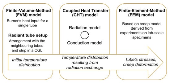 The heat transfer inside a CGL furnace is dominated by radiation and conduction. A developed CHT model was used to consider these two heat transfer mechanisms and determine their influence on the change in the tube’s temperature distributions due to its surroundings. Convection contributes marginally to the total heat transfer from the radiant tubes to the strip, accounting for around 5 to 10 percent (depending on the heat transfer coefficient) compared to radiative heat transfer. Therefore, the convective component of heat transfer was neglected in the CHT model. The CHT model was integrated into the previously mentioned FSI approach, developed by Karthik et al., as illustrated in Figure 4. The selected FSI approach followed a partitioned one-way coupling between the FVM and FEM models.