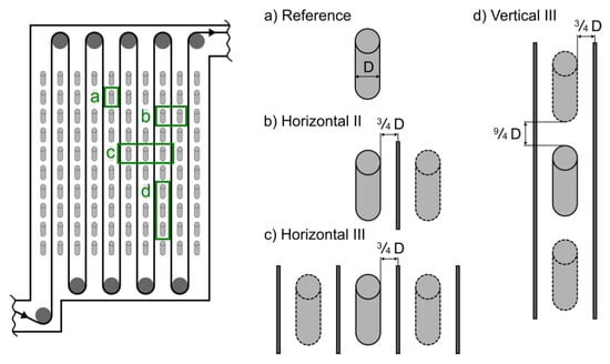 The heating and soaking sections of a CGL furnace offered a broad variety of different radiant tube setups to become the subject of investigation. Three different radiant tube setups were chosen, in addition to the previously described isolated radiant tube, to form the basis of the case studies in the present work, as shown in Figure 5. Setup (a) represented the case of a single tube unaffected by its surroundings. Setup (b) added a radiant tube, horizontally adjacent to the first one. The strip—passing between both tubes—was also taken into account. In order to maximize the number of horizontal neighbors, a second adjacent tube was considered in setup (c). The number of strip-passes also increased in the case of the three-tube horizontal setup, making a total of four passing strips. In addition to the influence of the horizontally adjacent neighbors, the vertical ones also needed to be investigated. Therefore, three vertically-stacked tubes in a column, enclosed by two passing strips, were chosen for setup (d). It could be noted that the relative positions of the tubes and the strip in the setups were based on recommendations by radiant tube manufacturers [38]. These positions were also confirmed with real CGL furnace dimensions.