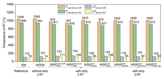 The first step in assessing the effect of the radiation exchange on the parameters indicating the tube’s lifetime involved taking a closer look at the calculated temperature distribution of the individual cases with their boundary conditions. For each case, four characteristic temperature values are shown in Figure 7: the maximum tube temperature (Tmax) and the temperature difference (ΔT) between the maximum and minimum magnitudes for both the burner-on point and -off point distributions.