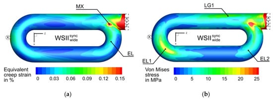 Spatially resolved, the temperature distributions of the reference case (I) showed high temperatures at the first elbow and minimum temperatures at the pinned support (XYZ) [35]. The cases II to IX that were influenced by surroundings showed similar locations of the maximum and minimum temperatures. However, the local distribution of temperatures in the legs and elbows changed accordingly, as shown in Figure 8. Figure 9a shows the creep strain distribution on the tube for case VI at a time of 250 of the total 400 calculated hours. The maximum creep strain occurred at the meeting point of the second elbow to the first leg, followed by the maximums in the first leg, first elbow, and the second elbow, respectively. To evaluate and compare the individual calculations, a point EL (= elbow) was selected on the second elbow. The position of the maximum occurring creep strain MX (= maximum) was not used since the numerical error could not be ruled out due to the proximity to the pinned support (XYZ). It should be noted that the evaluation of both points MX and EL did not show any qualitative deviations.