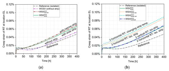 The creep strains at location EL for the reference case (I) and certain selected setups with the strip (VI-IX) are shown in Figure 10b. Three different radiant tube arrangements were considered, based on setups (b), (c), and (d) (Figure 5). The effect of two radiating tube partners in vertical direction led to a lower creep strain than two horizontally adjacent radiating partners. This could be ascribed to the fact that the strip’s shielding of some of the neighbors’ radiation strongly influenced the temperatures arising on the tube. In this context, it was also obvious that two neighboring tubes had a greater influence on the central tube than only one neighbor did. By considering horizontally arranged tubes, it became apparent to take a look at the strip’s changing temperature during the passes. Compared to an isothermal strip, a variation in strip temperature led to an increase in the maximum creep strain in the tube.