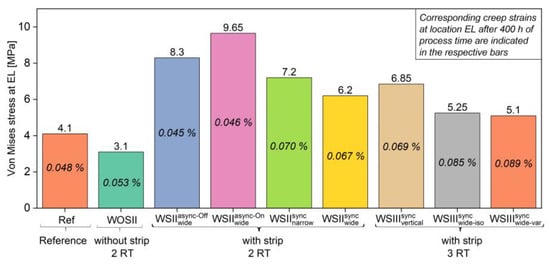 Von Mises stresses and corresponding creep strains at location EL after 400 h of process time for all nine cases.