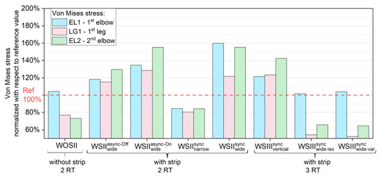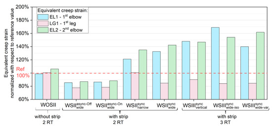 The comparison of creep strains and stresses was carried out not only at the primary evaluation point EL but also at three other secondary evaluation points, as shown in Figure 9b. These points were located on the first leg (LG1), the first elbow (EL1), and, likewise to point EL, on the second elbow (EL2). They represented the next three local maxima. The results of the creep strains and stresses for all nine cases are shown in Figure 13 and Figure 14, respectively. All values were normalized to the reference case (100%).