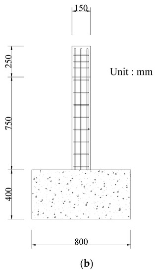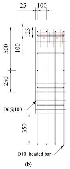 Specimen FPB, shown in Figure 4, is a specimen of two strengthened EPCWs either side of a column, in the form of a wing wall. The dimensions of each EPCW are 350 × 1000 × 70 mm, which correspond to 1/4 of the EPCW applied to Specimens FBC and FB. The PC wall applied to Specimen FPB is designed to facilitate lifting operations and transportation by reducing its size. Moreover, it has excellent constructability. The PC walls were connected to the foundation using D10 headed bars, as shown Figure 3b and Figure 4b. The EPCW and RC frame are connected using high-strength anchor bolts. The high-strength anchor bolts have a diameter of 26.5 mm, their yield and tensile strengths are 900 and 1100 MPa, respectively, and their elastic modulus is 205,000 MPa. The high-strength anchor bolts are assembled using hexagonal nuts and bearing plates, as shown in Figure 2. In addition, a strain gage is attached to the center of the anchor bolts to tighten the nuts until it they are about 300 , so that the same tensile force is introduced to the anchor bolts. In the frame and EPCW, concrete with a compressive strength of 21.8 MPa is used. The yield and tensile strengths of the D6 reinforcement are 381 and 426 MPa, and those of the D10 reinforcement are 502 and 619 MPa, respectively.