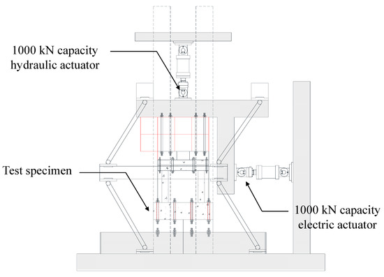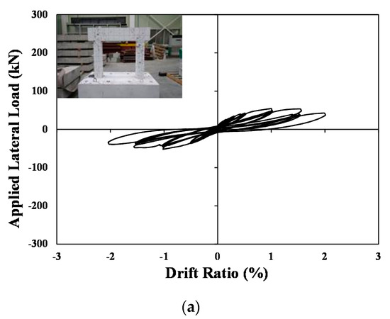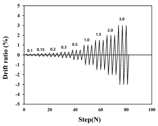 Figure 5 shows the test specimen installed in a loading frame. For axial loads, 10% of the specimen’s axial strength, including the axial strength of each wall, is kept constant under load control using a 1000 kN hydraulic actuator, until the end of the test. For lateral loads, displacement-controlled loading is applied using a 1000 kN capacity electric actuator. Figure 6 shows that iterative loading is applied three times at all story drift ratios in accordance with the preset target drift ratio (lateral displacement/height of the specimen).