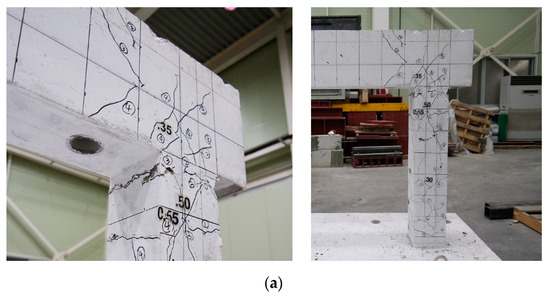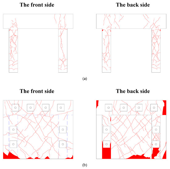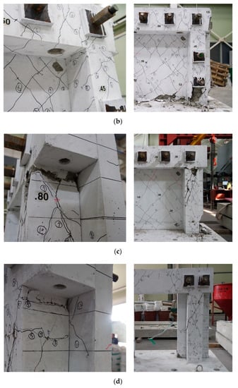 Figure 7 and Figure 8 show the crack patterns and photographs of test specimens after failure. For Specimen FC, the strength was reduced to 78% of the maximum load, as the cover peeled off at the top of the column after the first load cycle at 2.0% drift ratio. The test was then terminated in accordance with laboratory safety regulations. Specimen FBC achieved 90% of the maximum load at 2.0% drift ratio, but underwent failure as the load rapidly decreased during loading in the negative direction. This occurred after loading in the positive direction with a drift ratio of 2.0%. For Specimen FBC, as the EPCWs were connected to both the columns and the beam, significant crack damage was observed in the vicinity of the anchor bolts installed at the bottom of the columns, as shown in Figure 7b and Figure 8b. Specimen FB, in which the EPCW was connected only to the beam, underwent separation between the frame and the EPCW as the concrete peeled off at the EPCW–foundation connections at a 2.0% drift ratio. In terms of Specimen FB, the crack widths observed from the columns were smaller, while those observed from the walls were larger, compared to those of Specimen FBC. For Specimen FB, the strength was reduced to 65% of the maximum load at the third cycle with a drift ratio of 2.0%, and the test was terminated after the loading of the third cycle. In Specimen FB, where the EPCW was connected only to the beam with anchor bolts, relatively small damage was observed in the columns, as shown in Figure 7c and Figure 8c, compared to Specimen FBC. In Specimen FPB, to which two EPCWs were applied near the column in the form of wing walls, there was no significant decrease in the load, even at 2.0% drift ratio, and the test was terminated after loading at up to 3% drift in the positive direction. The load at 3.0% drift ratio was 94% of the maximum load, showing stable behavior without a significant decrease in load. Specimen FPB observed less damage in RC frames compared to other specimens, as shown in Figure 7d and Figure 8d.