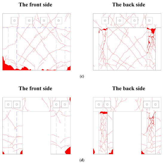 Observed crack patterns of specimens after failure: (a) Specimen FC; (b) Specimen FBC; (c) Specimen FB; (d) Specimen FPB.