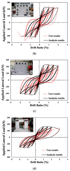 Figure 9 compares the test and analysis results obtained using the modified LDLEM. Table 2 summarizes the maximum strengths in the positive and negative directions in the test and analysis results. The strength ratios of the analysis/test results obtained from Specimen FB were 0.97 and 1.02 in the positive and negative directions, respectively. These strength ratios obtained from Specimen FBC were 0.96 and 0.81 in the positive and negative directions, respectively. These results show that that there was a tendency to underestimate the strength of the specimen in the negative direction, but the overall behavior was similar. These strength ratios obtained from Specimen FPB were 1.11 and 1.02 in the positive and negative directions, respectively. Therefore, it was found that the analytical method applied with the modified LDLEM accurately evaluated the overall behavior of specimens strengthened with precast walls.