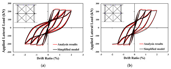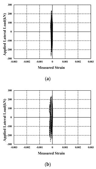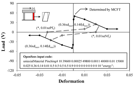 The column concrete is modeled by dividing it into the confined concrete inside the lateral reinforcement, and the unconfined concrete outside. For the material model of concrete, Yassin (1994)’s model [24] was used; while for the confined concrete, Mander (1988)’s model [25] was used. The reinforcement was modeled using the Giuffré–Menegotto–Pinto model [26]. As described above, for the shear behavior of the column member, the analysis result estimated using MCFT was modeled as the backbone curve of the Pinching 4 model [27] and added to the fiber section analysis model with the use of the section aggregator. With respect to the loading/unloading stiffness and strength degradation characteristics of the Pinching 4 model, the cyclic shear behavior was defined based on the test results of the column, as shown in Figure 12.