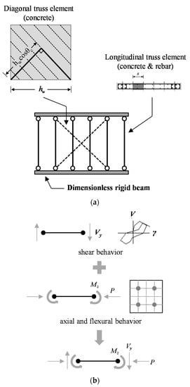 Many researchers [9,10,11,12,13,14] have developed nonlinear analysis methods to evaluate the behavior of reinforced concrete walls. In this study, the RC frame structures with non-seismic details were modeled as nonlinear beam–column elements [15,16,17,18], and the modeling of the walls was modified by applying the longitudinal and diagonal line element model (LDLEM) [14,19].