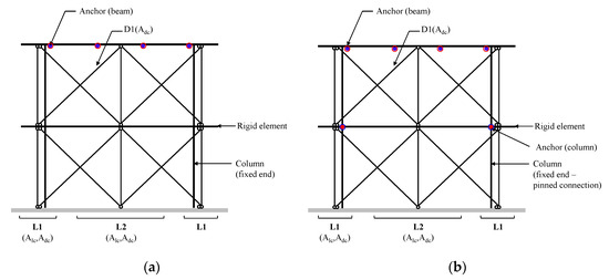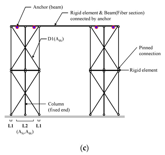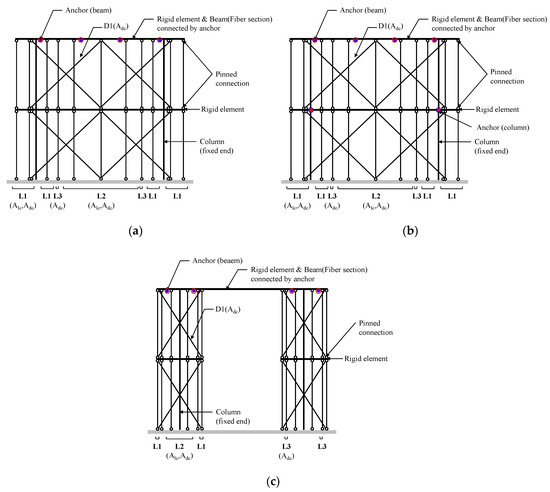 Figure 11a shows that the LDLEM consists of a beam element with infinite stiffness, and longitudinal and diagonal elements. It is a technique of modeling the longitudinal element to resist flexure, and the diagonal element to resist shear. In LDLEM, the diagonal member simulates the web concrete that resists shear force and is modeled to resist both tension and compression. Previous studies [10,11,20] have mainly dealt with barbell-type shear walls or infill wall analysis for seismic strengthening with the use of LDLEM. However, in this case, the two-dimensional elements can be modeled, because the frame and the wall are located on the same plane. For the PC wall proposed in this study, since the precast wall is attached and fixed by anchor bolts on the face the RC frame, it needs to be modeled as a three-dimensional element, unlike in the previous analysis. For this, the precast wall was modeled using LDLEM, and the RC frame was modeled to be in front of the wall as a fiber section.