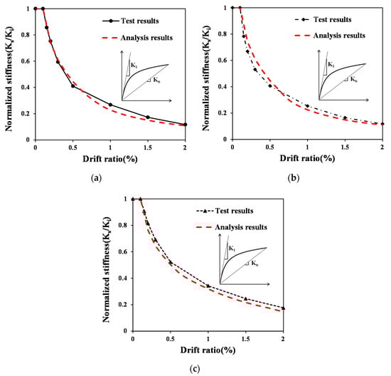 Figure 14 compares the test and analysis results regarding the secant stiffness of the specimens normalized by the ratio to the initial stiffness. The analysis results were found to accurately evaluate the secant stiffness degradation characteristics, indicating accurate predictions of the strength reduction characteristics according to each loading step.