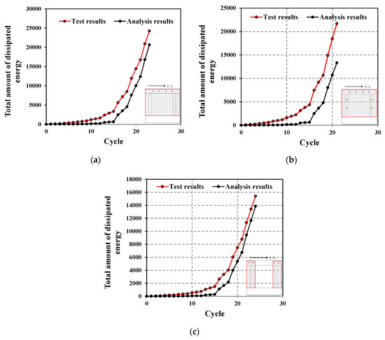 In order for the system to exert sufficient seismic performance, the structure must, after yielding, be able to dissipate sufficient energy. Therefore, cumulative energy dissipation serves as an important indicator related to the seismic performance of structures [4]. Figure 15 compares the amount of cumulative energy dissipation of specimens subjected to cyclic loads, and that of their energy dissipation calculated based on the analysis. In this study, the amount of cumulative energy dissipation was defined as the enclosed area of the load–displacement hysteresis loop. The analysis model provided relatively accurate evaluations of the energy dissipation capacity under cyclic loading. However, the difference between the test and analysis results regarding the energy dissipation capacity of Specimen FBC was relatively larger than that of the other test specimens. This is because a sudden increase in strength occurred in the negative direction during the test of Specimen FBC, as shown in Figure 9b.