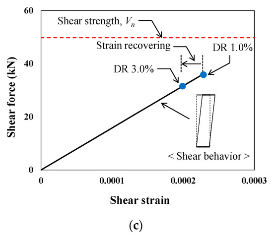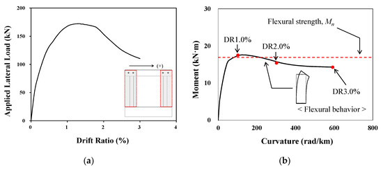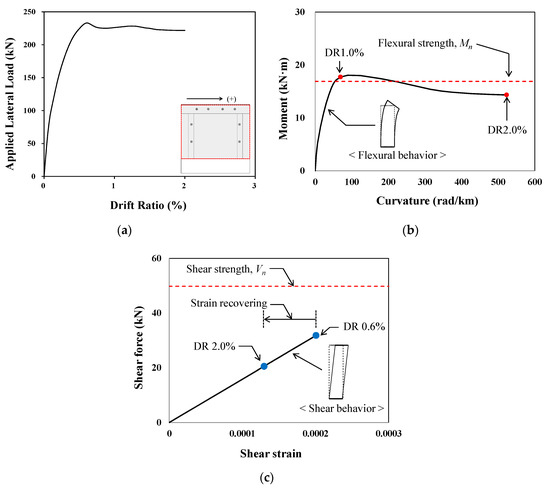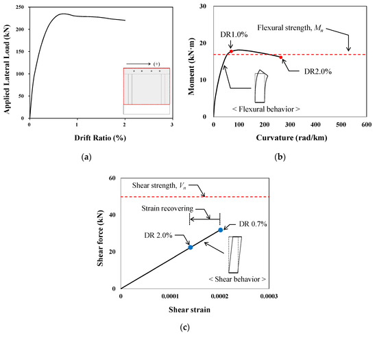 The behavior of the column member was analyzed in detail to verify whether the analytical method presented in this study properly evaluates the failure mode of the specimen. Figure 16 shows the pushover analysis, the moment–curvature relationship and the shear force–shear strain relationship of the column member of Specimen FB. The moment–curvature relationship of the column shown in Figure 16b revealed that the moment of the column increased gradually and, after reaching the flexural strength (), the column exhibited ductile behavior. On the other hand, in the shear force–shear strain relationship of Figure 16c, the shear force did not reach the shear strength (), and the shear strain was recovered with a decrease in shear force at 0.7% drift ratio. The results of Specimens FBC and FPB, shown in Figure 17 and Figure 18, also confirmed that, similar to the characteristics shown in Figure 16, flexure-dominant behavior occurred, and shear was found to behave in the elastic region. These results indicate that, after reaching the flexural strength (), the column exhibits ductile behavior and the precast walls suffer failure. These behavior patterns are consistent with the test results and this leads to the conclusion that the proposed analysis method can adequately predict the failure mode of the columns.