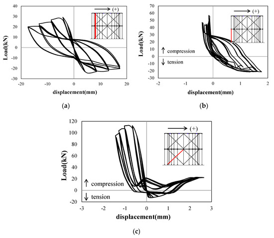 Estimated load–displacement responses of elements in Specimen FB: (a) column; (b) longitudinal element; (c) diagonal element.