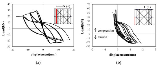Figure 19, Figure 20 and Figure 21 show the force–displacement responses of major elements in Specimens FB, FBC and FPB. Since the column of the frame structure shown in Figure 19a was modeled as a nonlinear beam–column element, it was represented by global lateral displacement and global lateral force. On the other hand, the longitudinal and diagonal elements of the wall shown in Figure 19b,c were represented as the axial displacement and axial force, respectively. This was because they were modeled as truss elements. Figure 19a shows that Specimen FB exhibited frame behavior that was similar to that of Specimen FC, and showed a characteristic after the ultimate load in which the load decreased slowly with an increase in displacement. In relation to the longitudinal element of Figure 19b, there was a rapid increase in displacement along with the yielding of reinforcement on the tension side, while elastic behavior occurred on the compression side. Since the diagonal element shown in Figure 19c is a concrete element without reinforcement, it does not resist tension well, but does resist high loads in compression. In addition, as the strength decreased after reaching the maximum compressive strength, it reached strain softening, unlike the longitudinal element. The force–displacement responses of major elements in Specimen FBC shown in Figure 20 are similar to the results of Specimen FB, as shown in Figure 19. However, it is judged that the local behavior of the column ends results in a difference in some of the deformation capacities. With respect to the longitudinal element of Specimen FPB, as shown in Figure 21b, the strength decreased after reaching the maximum compressive strength, and the maximum tensile strength and the compressive deformation further increased compared to Specimens FB and FBC.